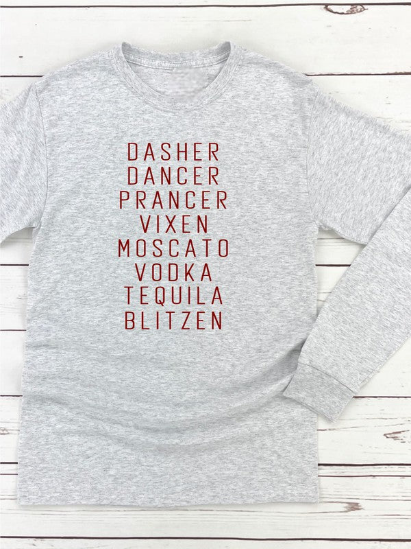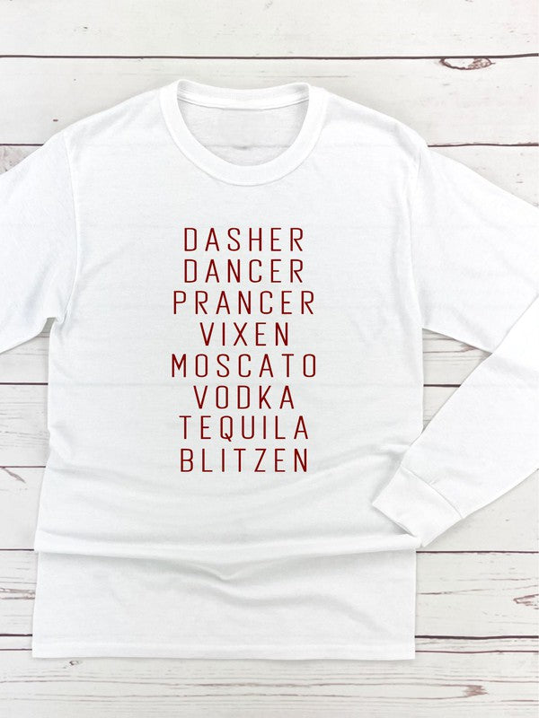 Maroon Print - Dasher Dancer Prancer Vixen Moscato Vodka Tequila Blitzen Crew Neck Long Sleeve Graphic Tee