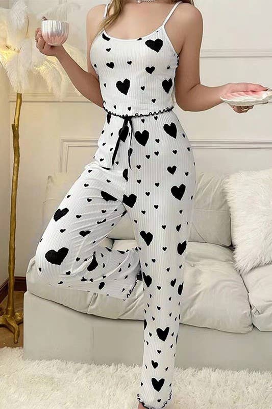 Valentines Heart Print Cami Pajama Lounge Set: WhiteB / L