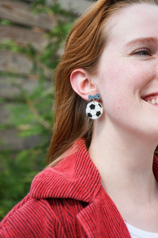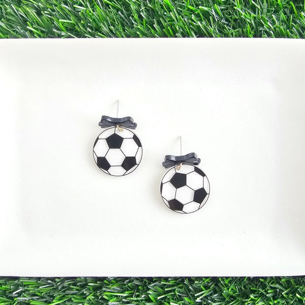 Celebrate every goal, save, and sideline snack in sparkly fashion with our Game Day Bow Soccer Earrings! Featuring a dainty black bow and a glittery black-and-white soccer ball charm, these earrings are your new MVP for match day flair.
